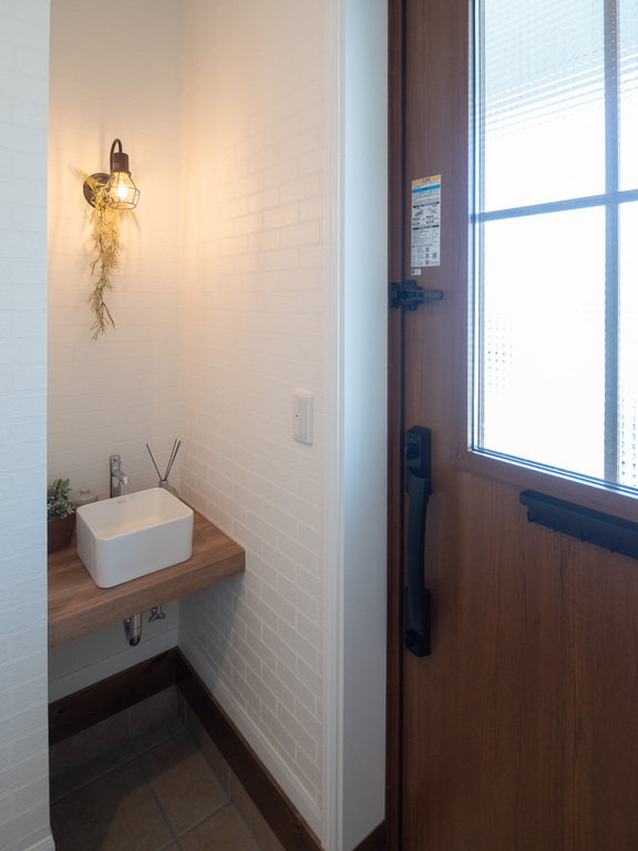 十字の格子とチェッカーガラスが特徴的な玄関ドア。モダンファームハウスの特徴であるモノトーンと木材等の異素材を合わせたファサードを形成します。スマートキー仕様でカギの開閉もらくらく。