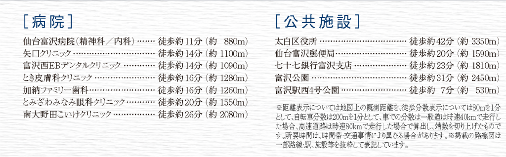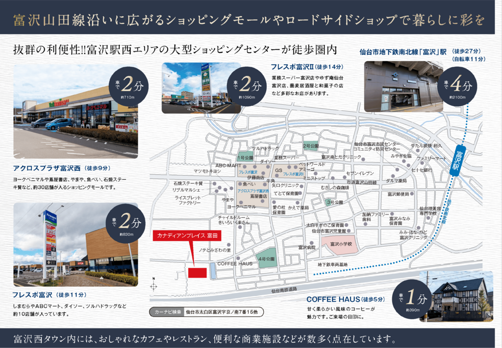 ・地下鉄富沢駅まで車6分(2.1Km)、長町南駅まで車9分(3.5Km)