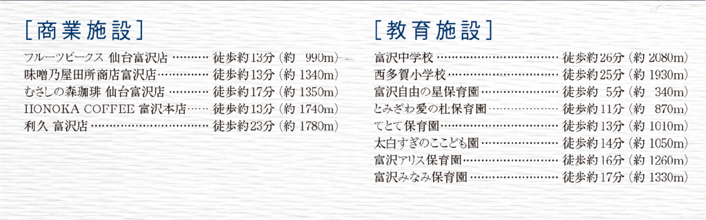 | 交通 | 地下鉄南北線「富沢駅」徒歩27分(2100m)/宮城交通バス「富沢西」バス停:徒歩14分(1100m |