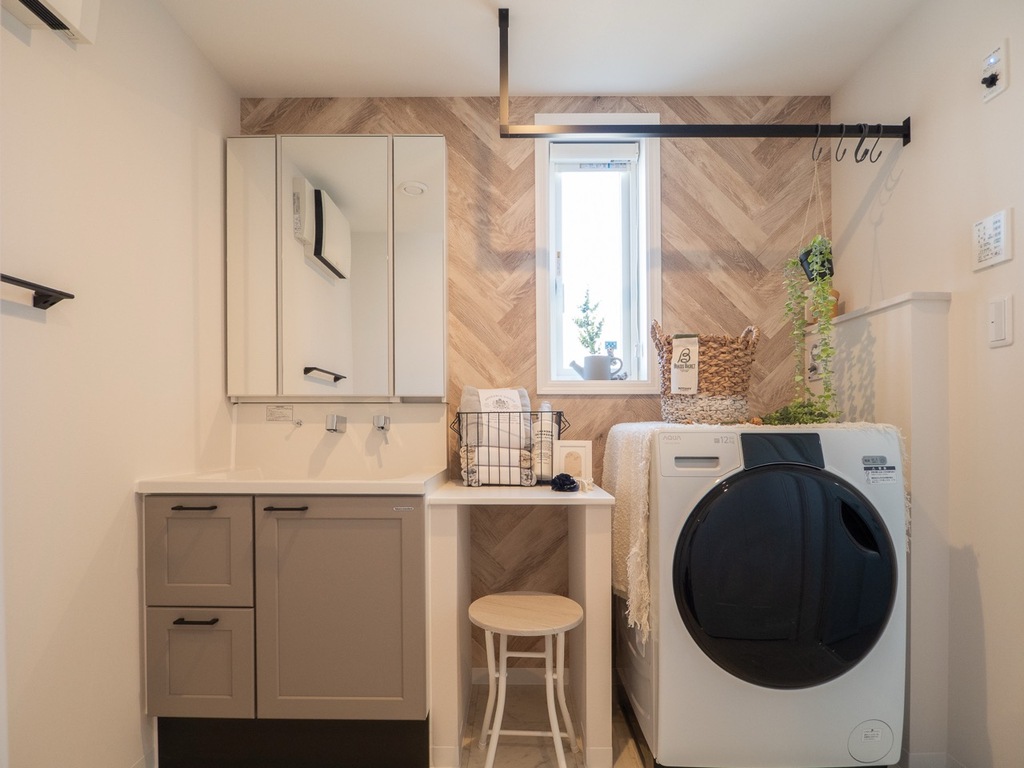 【家事動線】帰宅後すぐに手を洗える玄関洗面や、回遊動線のLDK、ランドリールームを兼ねた洗面室、お料理したらそのまま配膳できる横並びのキッチン・ダイニンングなど、家事が楽になる間取りです。
