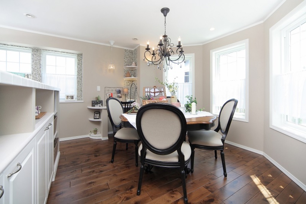 多角形に配置された窓から、一日中たっぷりと自然光が差し込み、開放感にあふれた明るい食卓を演出します。朝食の時間から夕暮れ時まで、移りゆく光の表情を楽しみながら家族との時間を過ごせる、この家一番の贅沢な空間です。