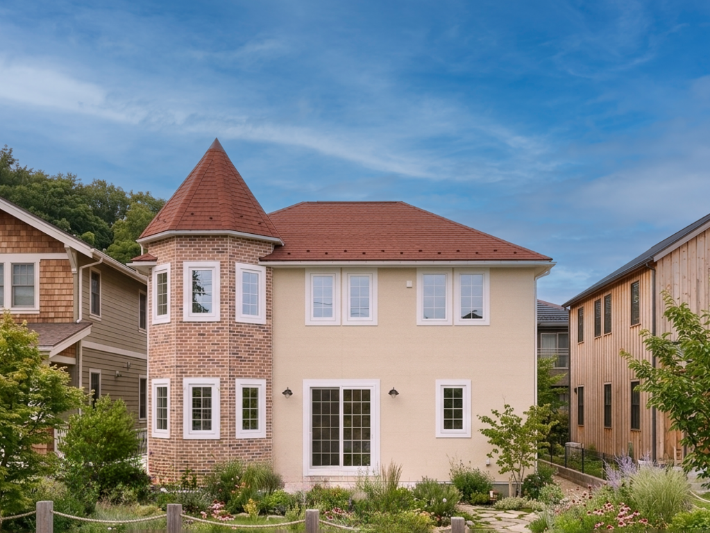 輸入住宅ならではの、多角形が突き出した独創的で気品あふれるシルエットは、街並みの中でもひときわ目を引く美しさです。