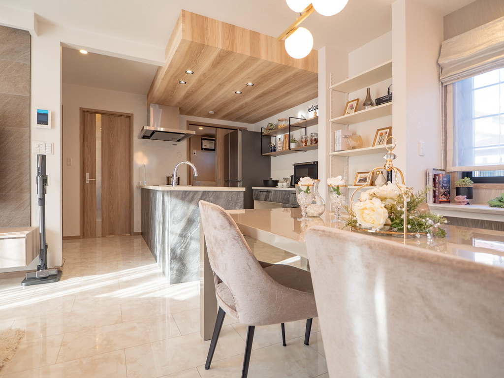 そして、視界が抜けるフラットキッチンと横並びダイニングを組み合わせが、限られた広さを感じさせない開放的なLDKを実現。