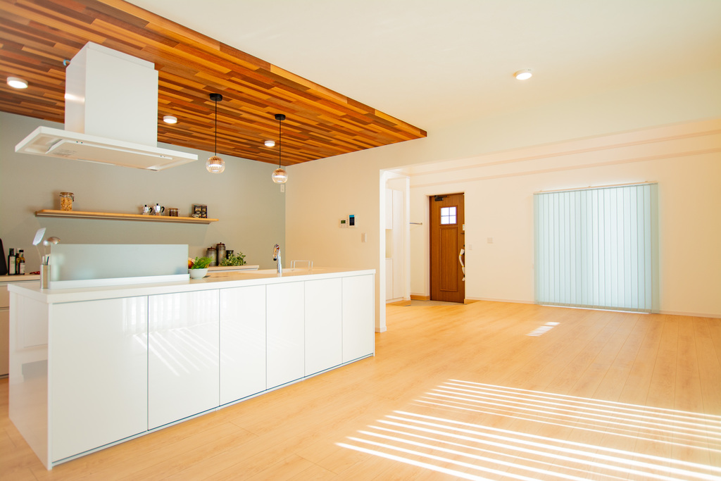 5mの勾配天井や玄関が一体になったLDKなど、開放感を意識した平屋となっております♪